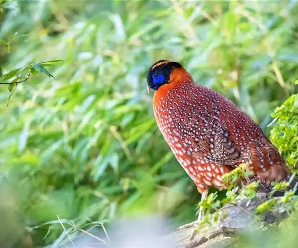 红腹角雉(学名:Tragopan temminckii)属于鸡形目雉科,雄鸟体羽及两翅主要为深栗红色,满布具黑缘的灰色眼状斑,下体灰斑大而色浅。雌鸟上体灰褐色,下体淡黄色,杂以黑、棕、白斑。
