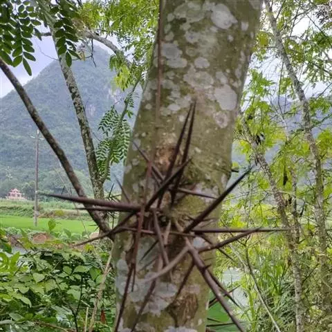 落叶乔木或小乔木,高达25米;小枝紫褐色或脱皮后呈灰绿色,微有棱,具分散的白色皮孔,光滑无毛;刺略扁,粗壮,紫褐色至棕黑色,常分枝,长2-15.5厘米。