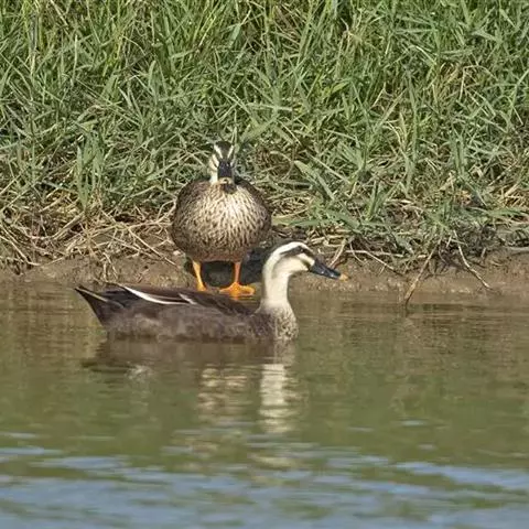 绿头鸭属游禽,大型鸭类。体长47-62厘米,体重大约1千克,外形大小和家鸭相似。雄鸟嘴黄绿色,脚橙…