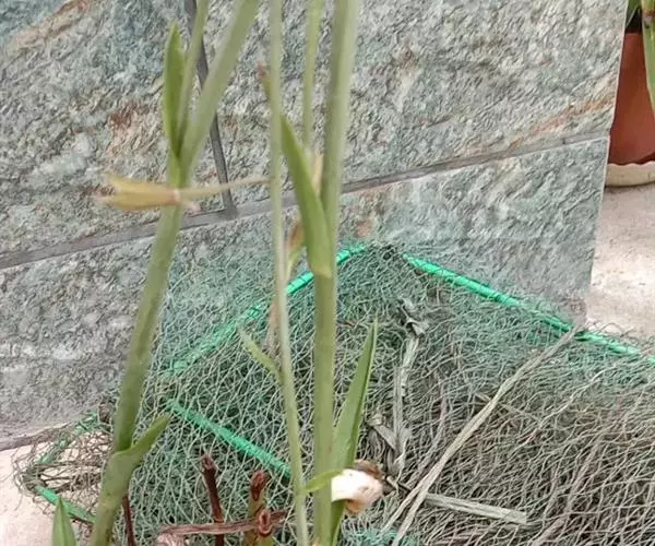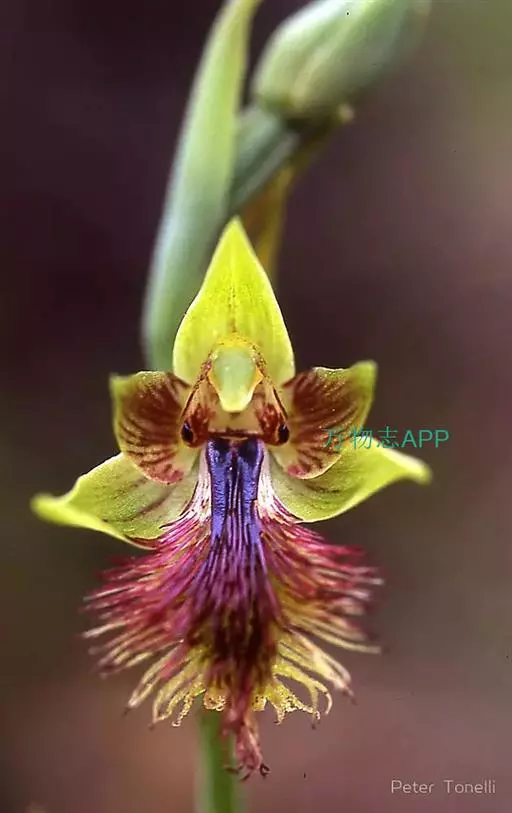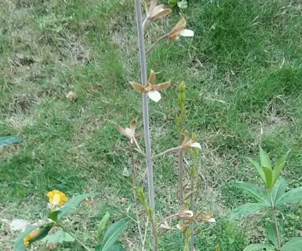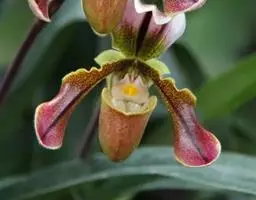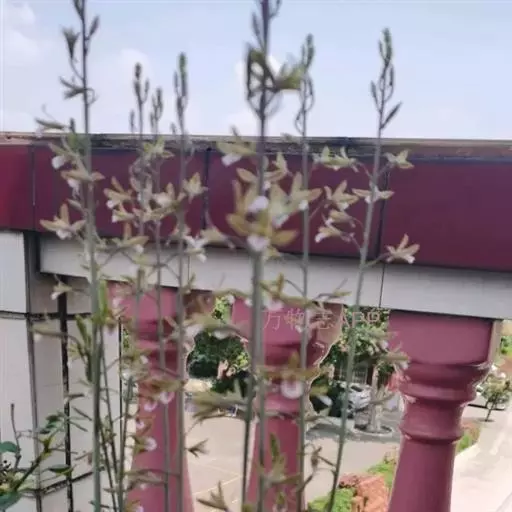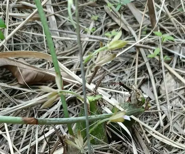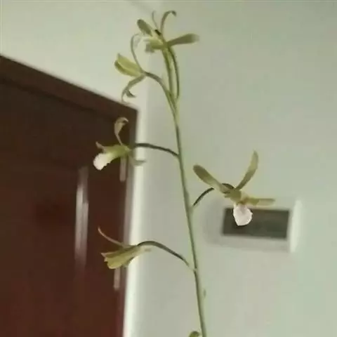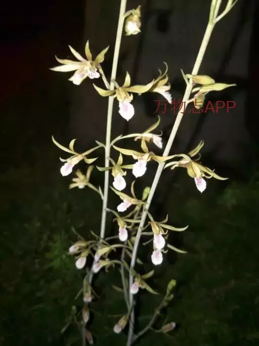 花葶从假鳞茎一侧节上发出,高43-65厘米或更高,中部以下有数枚鞘;鞘长1.5-3.5厘米;总状花序直立,长20-40厘米,常有1-2个侧分枝,疏生多数花;花苞片草质,线状披针形,长4-8毫米,宽约2毫米,先端长渐尖;花梗和子房长1.5-1.9厘米;花橄榄绿色,唇瓣白色而具淡紫红色褶片;中萼片倒披针状线形,长1.1-1.3厘米,宽1.5-2毫米,先端渐尖;侧萼片与中萼片相似,常略斜歪而稍大。