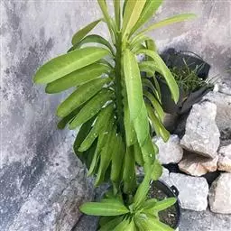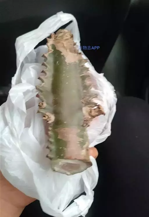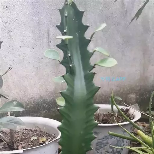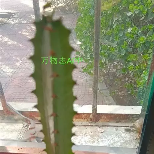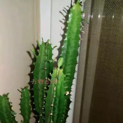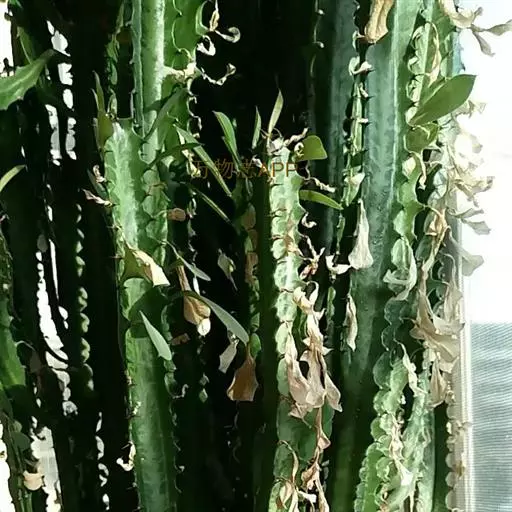 霸王鞭 肉质灌木,具丰富的乳汁。茎高5-7米,直径4-7厘米,上部具数个分枝,幼枝绿色;茎与分枝具5-7棱,每棱均有微隆起的棱脊,脊上具波状齿。