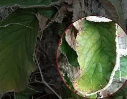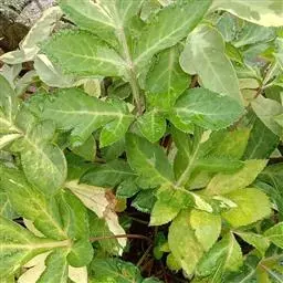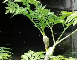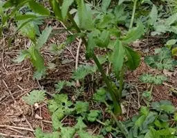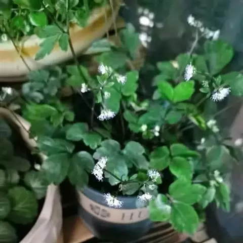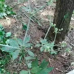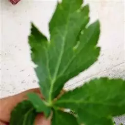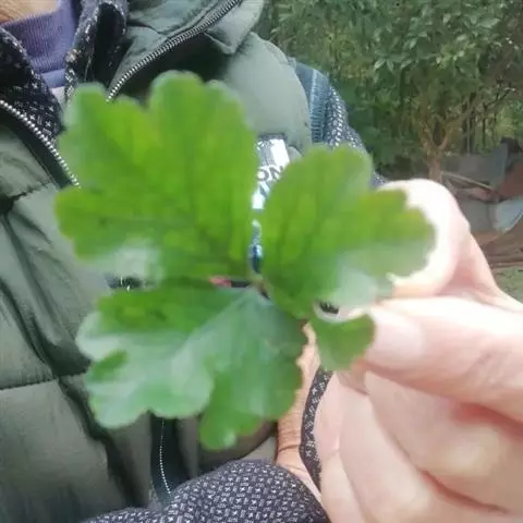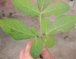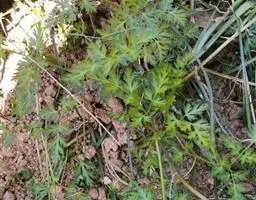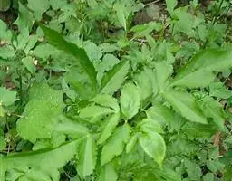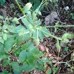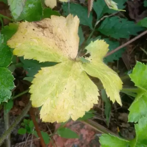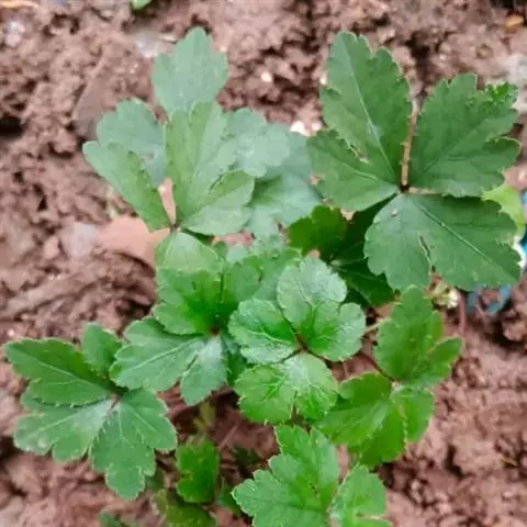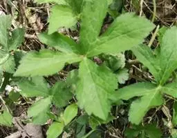基生叶多数,柄长13—55厘米,基部有宽膜质鞘;叶片通常圆心形或肾状圆形,长3.5—10厘米,宽6.5—12厘米,掌状3裂,中间裂片倒卵形,基部楔形,侧面裂片宽倒卵形,通常2裂至中部或中部以下,所有裂片表面深绿色,背面淡绿色,上部2—3浅裂,边缘有锯齿,齿端尖,呈刺毛状;总苞片2,叶状,无柄,每片3深裂,裂片倒卵形至倒披针形,长3.5—9厘米,宽1.5—4.5厘米,边缘有锯齿。