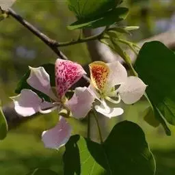 洋紫荆的花和叶长得十分有趣。它的花有五片花冠,四片对称地分裂两侧,一片翘起在上方,布满色调颇浓的彩斑,很像兰花的花舌,因此有人称它为“兰花树”。三色堇在南方被人叫做“蝴蝶花”,其实,这顶桂冠戴在豆科植物洋紫荆的头上,也是合适的。
