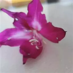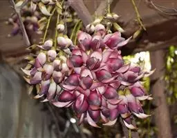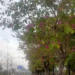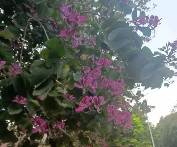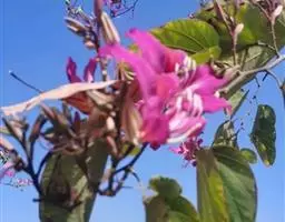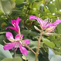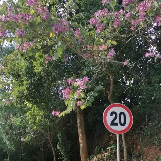 羊蹄甲(学名:Bauhinia purpurea Linn.):乔木或直立灌木,高7-10米;树皮厚,近光滑,灰色至暗褐色;叶硬纸质,近圆形,先端分裂达叶长的1/3-1/2,裂片先端圆钝或近急尖,两面无毛或下面薄被微柔毛。总状花序侧生或顶生,少花,长6-12厘米;花蕾多少纺锤形,具4-5棱或狭翅,顶钝;花瓣桃红色,倒披针形,长4-5厘米,具脉纹和长的瓣柄。荚果带状,扁平,略呈弯镰状,成熟时开裂;种子近圆形,扁平,种皮深褐色。花期9-11月;果期2-3月。