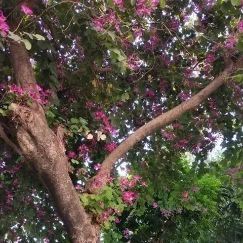 洋紫荆:落叶乔木;树皮暗褐色,近光滑;幼嫩部分常被灰色短柔毛;枝广展,硬而稍呈之字曲折,无毛。叶近…