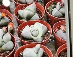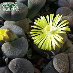 荒玉为番杏科生石花属,原产南非。株体呈白粉色,表面布满凹凸纹路,凹陷处为红褐色,每年秋季开黄花。