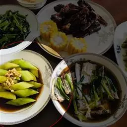 1.事先将干香菇、干金针菇和干黑木耳泡发,五花肉切薄片