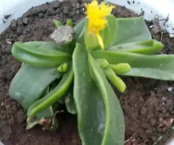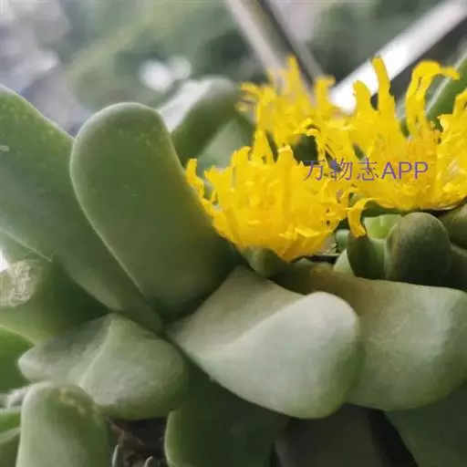 多肉植物,植株呈肉质灌本状,高20~30厘米,茎有短节,多分技。叶集中 快刀乱麻 在分枝顶端,对生,细长而侧扁,长约1.5厘米,先端两裂,外侧圆弧状,好似一把刀,叶色淡绿至灰绿色。花黄色,直径4厘米左右。