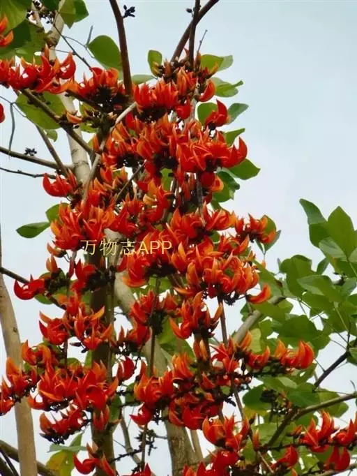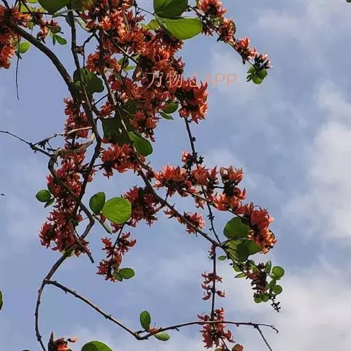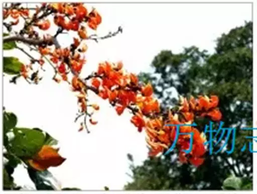 紫矿(Butea monosperma(Lam.) Kuntze),别名紫铆、胶虫树,蝶形花科(Papilionaceae)紫矿属落叶乔木,高10-20m。羽状三出复叶,革质,顶生小叶宽卵形或圆菱形,较大,侧生小叶歪卵形。总状或圆锥花序生于无叶枝的节上,花萼钟状,花大,桔红色,后渐变橙黄,形如小鸟,花萼像头部,翼瓣如张开的双翅,龙骨瓣似娇小的身躯,仿佛栩栩如生的鸟儿在空中快乐飞翔。
