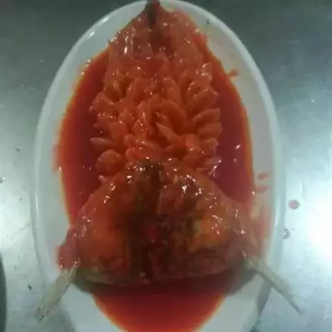 清蒸过江鱼是一道美食,由活鲤鱼、葱等原料做成。