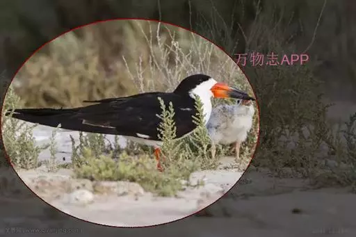 黑剪嘴鸥 剪嘴鸥体大(42厘米)的燕鸥样鸟。具橙红色的大嘴,顶冠色深,上体褐色,下体、后颈、次级飞羽横纹、尾上覆羽及尾均白。亚成鸟褐色而具白色鳞状斑纹。两翼甚长。特征为下嘴长于上嘴。