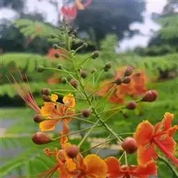 洋金凤 Sw.),豆科小凤花属灌木状或小乔木植物,枝无毛,绿或粉绿色;二回羽状复叶;总状花序伞房状,…