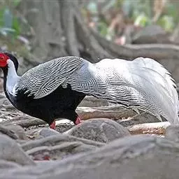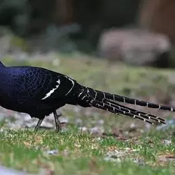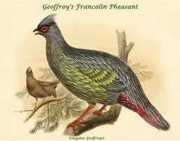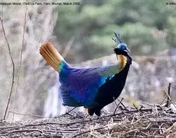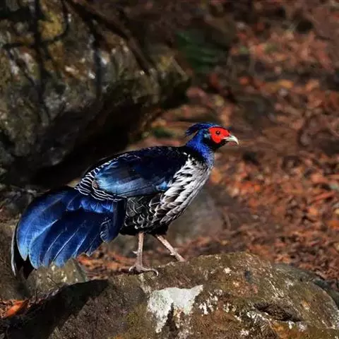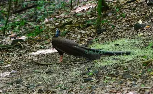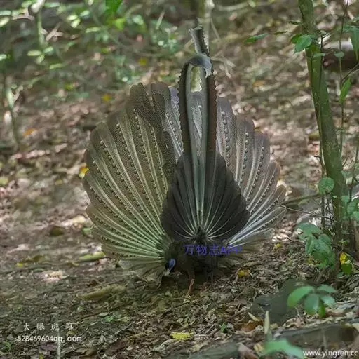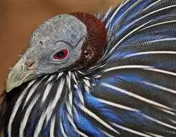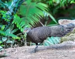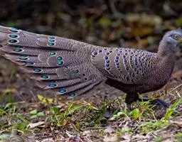 大眼斑雉(学名:Argusianus argus):体长160-200厘米,雄鸟尾长105-143厘米;雌鸟体长72-76厘米,雌鸟尾长30-36厘米;雄鸟体重2040-2725克,雌鸟体重1590-1700克。体羽总体为褐色,头及颈均为蓝色,上胸赤红色,冠及颈背的羽毛黑色,脚呈红色。是东南亚最美丽的鸟类,翅的下端长有多个蓝色斑点,好像一双双明亮的大眼睛,大眼斑雉也由此得名。