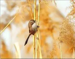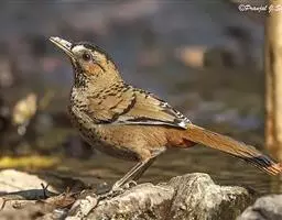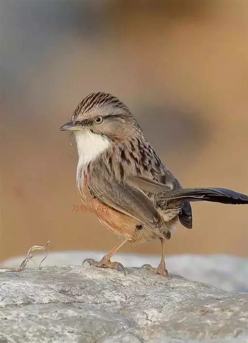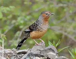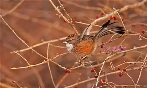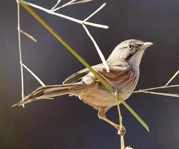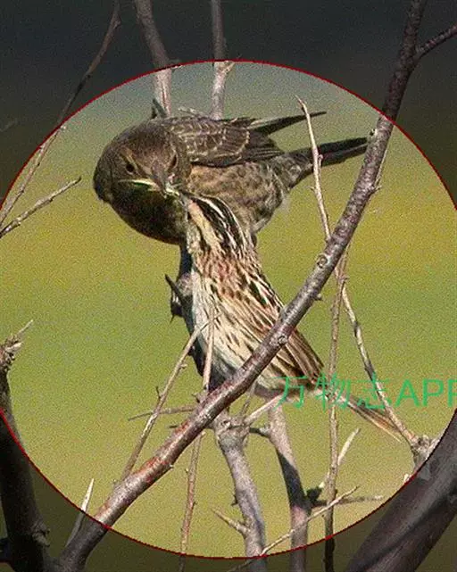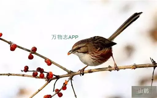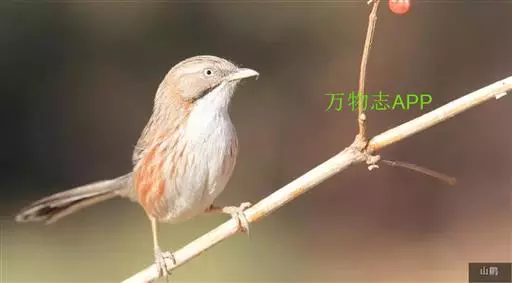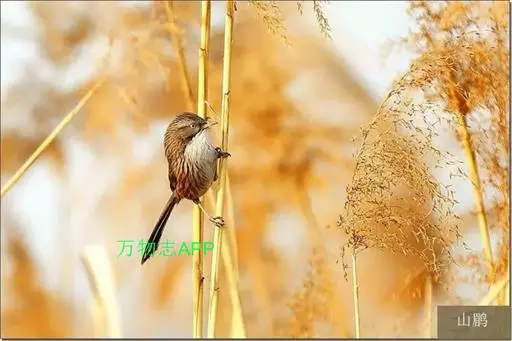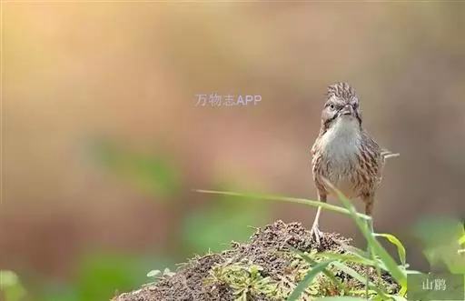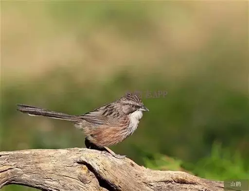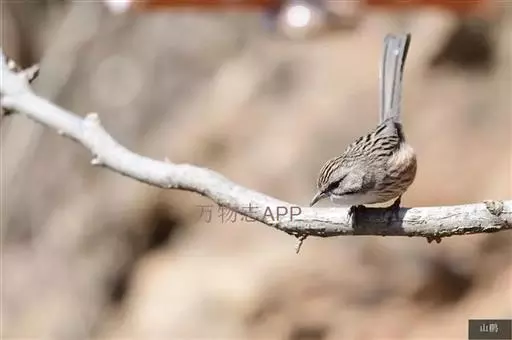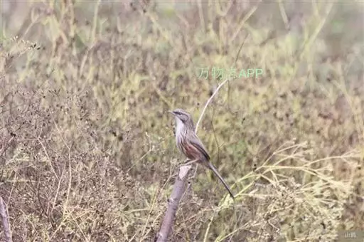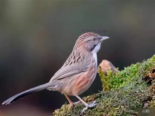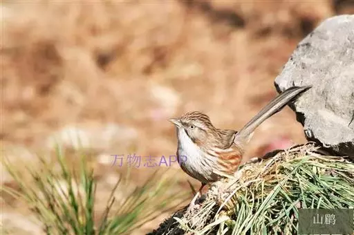 山鹛(学名:Rhopophilus pekinensis):是一种体形修长的莺类,尾尤其长,体长可达18厘米左右,上体以灰色为基色,头、颊、背、翅均为灰色中夹带纵向褐色斑纹,头部具淡色眉纹,但并不明显。自颊纹以下的喉部和整个下体均为浅色,自胸以下开始出现长而直的栗色纵纹,纵纹颜色鲜艳与腹部污白色的底色对比鲜明,这些纵纹从前到后逐渐变粗颜色变深,直到尾下覆羽全部过渡为栗色。尾羽端部污白色。虹膜褐色,嘴角质色,脚黄褐色。
