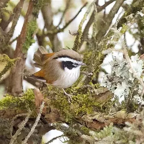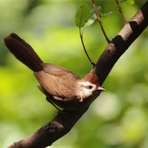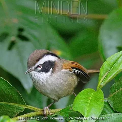 黑顶噪鹛:中型鸟类,体长24-26厘米。前额、脸、颏、喉黑色,头顶黑褐沾棕或深棕橄榄褐色,…