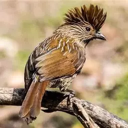 条纹噪鹛是画眉科、噪鹛属中型鸟类,体长28-32厘米。头具短的羽冠,上体栗褐色,飞羽外翻蓝灰色。…