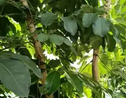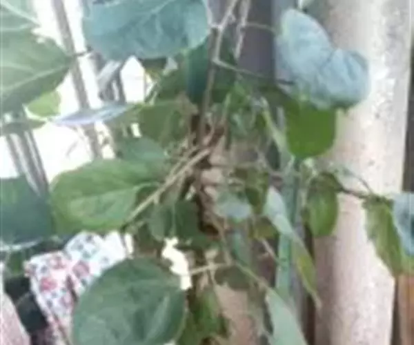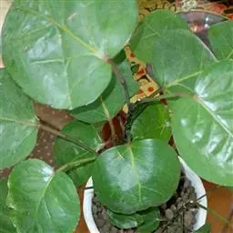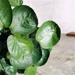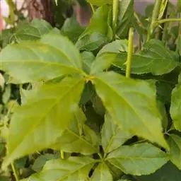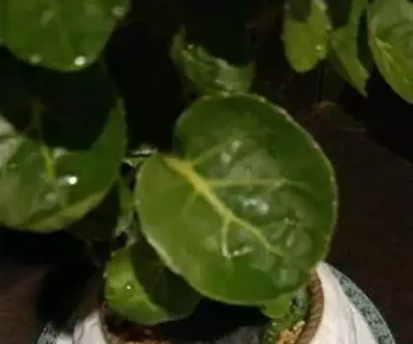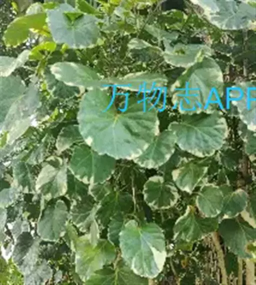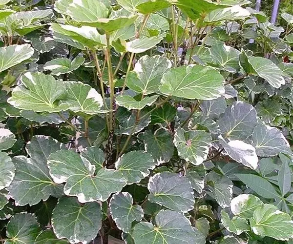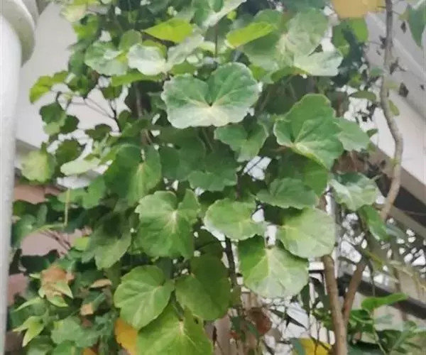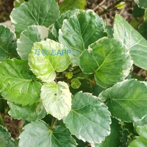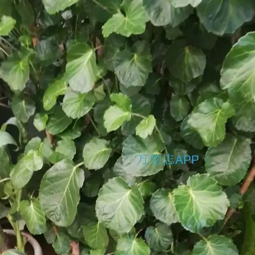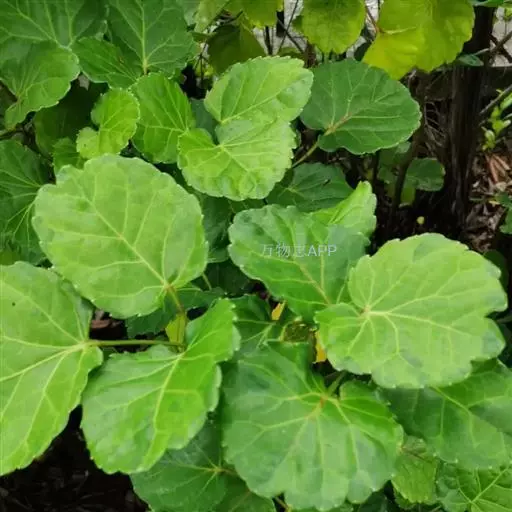 圆叶南洋参 茎带同色,茎枝表面有明显的皮孔。叶为一回羽状复叶,小叶阔圆肾形,直径约为10厘米,叶缘有粗钝锯齿或不故规则浅裂,先端圆,基部歆心形,叶缘稍带白色,薄肉质。