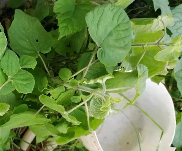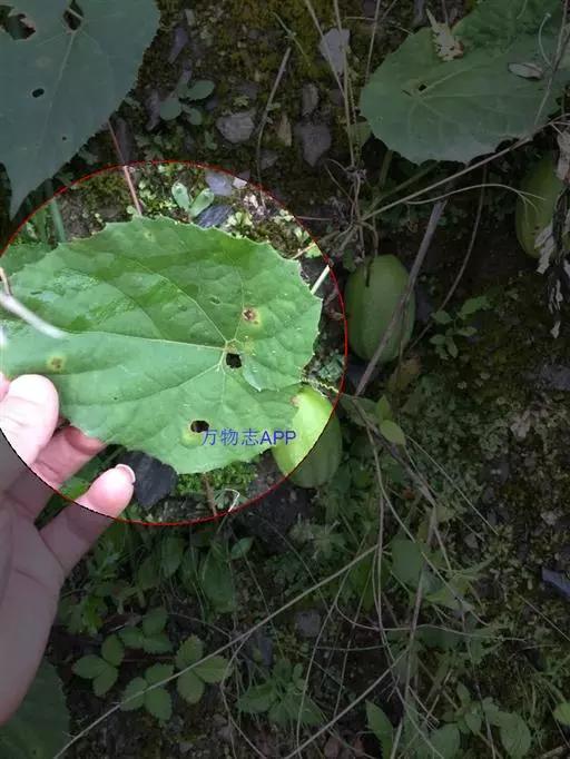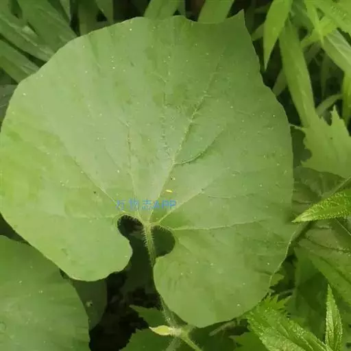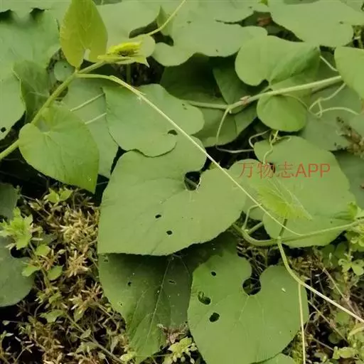 攀援草质藤本,全株被黄白色的长柔毛状硬毛;根块状;茎稍粗壮,有棱沟。叶柄稍粗,长2-6厘米;叶片宽卵状心形,长5-8厘米,宽4-9厘米,边缘浅波状,有大小不等的细齿,先端急尖或短渐尖,基部心形,弯缺深,近圆形或半圆形,深1-1.5厘米,宽1.5-3厘米,两面粗糙,脉上有长硬毛,最基部1对叶脉沿叶基弯缺边缘向外展开。卷须纤细,被长柔毛,单一。
