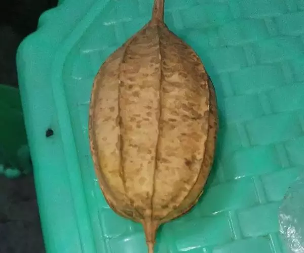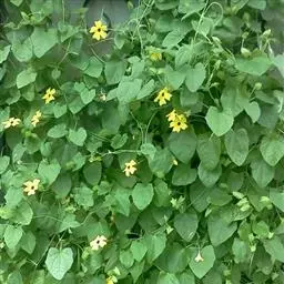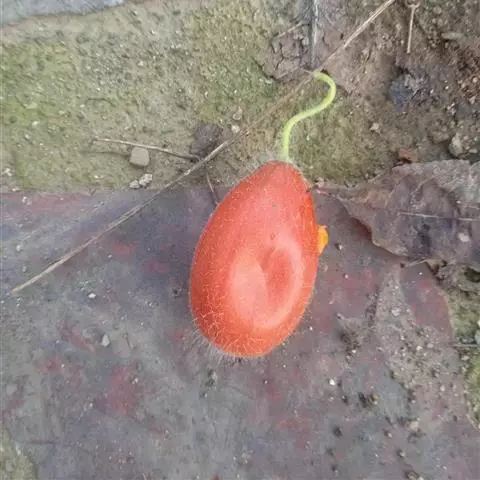 雌雄异株;雄花单生或聚生于短枝的上端呈假总状花序,有时2-3花生于总梗上,花梗细长,长1.5-3.5厘米,被柔软的长柔毛;花萼筒极短,近辐状,长约3-4毫米,上端径7-8毫米,裂片披针形,向外反折,长12-13毫米,宽2-3毫米,具3脉,两面有长柔毛;花冠黄色,裂片长圆形,长2-2.5厘米,宽0.8-1.2厘米,上部向外反折,先端稍急尖,具5条明显的脉,外面被短柔毛,内面有极短的疣状腺点;雄蕊5,着生在花萼筒檐部,其中1枚分离,其余4枚两两稍靠合,花丝极短,有短柔毛,长2-2.5毫米,花药卵形,长约2毫米;退化子房半球形。雌花单生,花梗细,长1-2厘米,有长柔毛;花萼和花冠雌雄花;退化雌蕊5,棒状,长约2毫米;子房长圆形,长0.5-0.8厘米,外面密被淡黄色长柔毛,花柱无毛,自3-4毫米处分3叉,分叉部分长约3毫米,柱头膨大,肾形,2裂。果实卵状长圆形,长4-5厘米,径2.8厘米,顶端有残留的柱基,基部稍变狭,表面橙黄色或红棕色,有光泽,被柔毛,具10条明显的纵纹。种子卵形,黑色,平滑无毛,长4-4.3毫米,宽2.5-3毫米,厚1.5毫米。花期6-8月,果期8-10月。