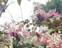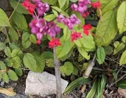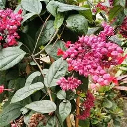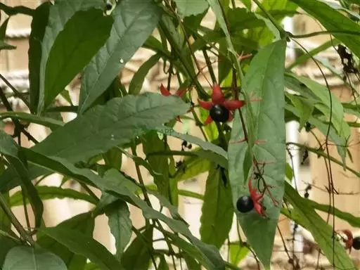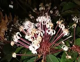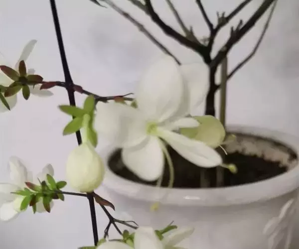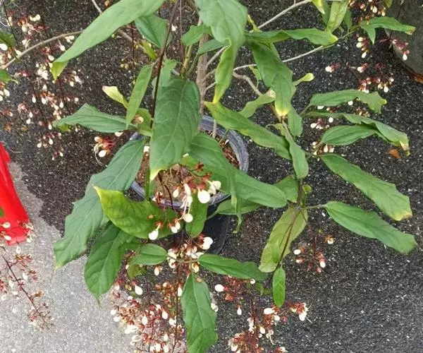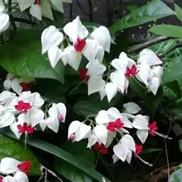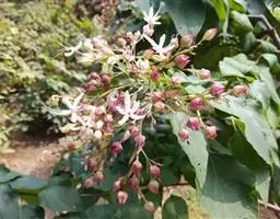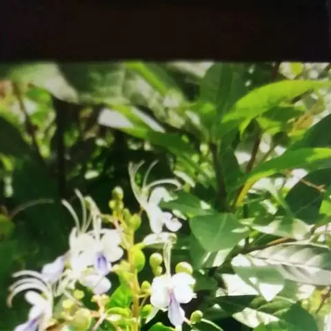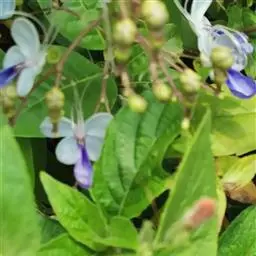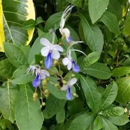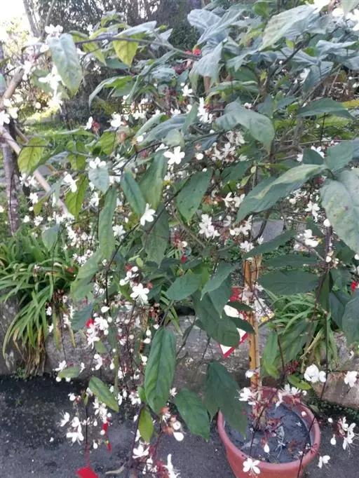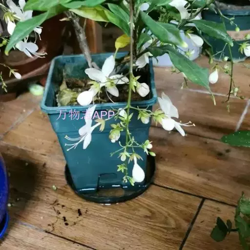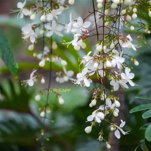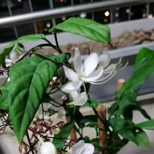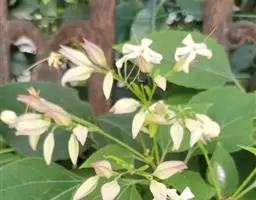 垂茉莉又名垂枝茉莉、黑叶龙吐珠,花朵形似白蝴蝶。枝条纤细,花姿飘逸,盛开时花香扑鼻,果期为春夏之际。果成熟时,花蕚增大增厚,由鲜红色转为紫红色,衬托着小巧玲珑果实。球形核果,初时黄绿色,成熟后光亮紫黑色,倒挂,故有“黑叶龙吐珠”之称。