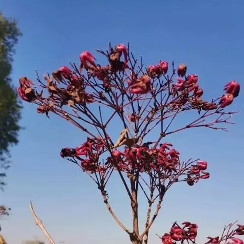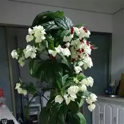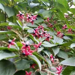 聚伞花序排列成圆锥状,长20-33厘米,下垂,无毛,每聚伞花序对生或交互对生,着花少数,花序梗及花序轴锐四棱形或翅状;苞片小,线形或钻形;花萼长约1厘米,萼管很短,裂片卵状披针形,长7-8毫米,果时增大增厚,鲜红色或紫红色;花冠白色,花冠管长约1.1厘米,裂片倒卵形,长1.1-1.5厘米;雄蕊及花柱伸出花冠,花丝在花后旋卷。