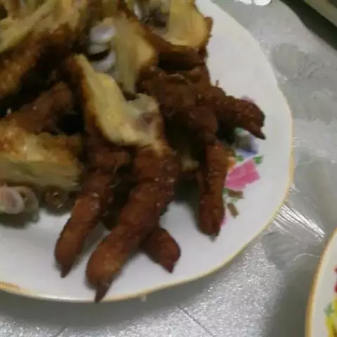 4、取出小排沥尽水后,入油锅大火炸至表面金黄捞出备用;