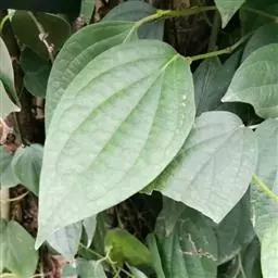 蒌叶(学名:Piper betle L.)是胡椒科、胡椒属的攀援藤本植物;枝稍带木质,节上生根。叶片纸质至近革质,阔卵形至卵状长圆形,顶端渐尖,两侧相等至稍不等,腹面无毛,叶脉最上1对通常对生,网状脉明显;叶柄被极细的粉状短柔毛;花单性,雌雄异株,聚集成与叶对生的穗状花序。总花梗与叶柄近等长,花序轴被短柔毛;苞片圆形或近圆形,无柄,盾状,花药肾形,花丝粗,子房下部嵌生于肉质花序轴中并与其合生,浆果顶端稍凸,5-7月开花。