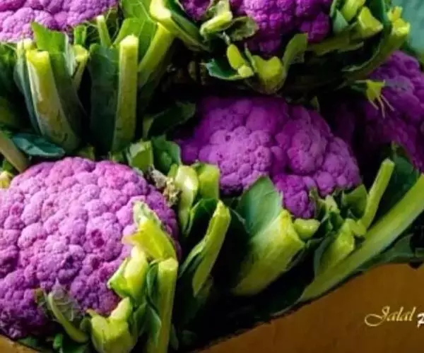 紫色品种花椰菜 花椰菜富含膳食纤维、蛋白质、维生素、脂肪、碳水化合物及矿物质等。其中胡萝卜素含量是大白菜的 8 倍,维生素 B2 的含量是大白菜的 2 倍。钙含量较高,堪与牛奶中的钙含量媲美。是含有类黄酮最多的食物之一。含有一种抗氧化剂异硫氰酸盐化合物。因此花椰菜的食用价值和保健功能都非常高。