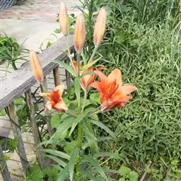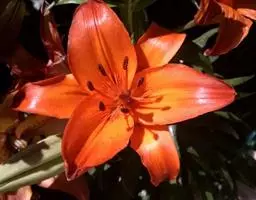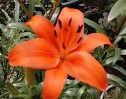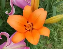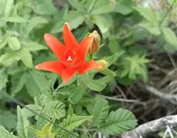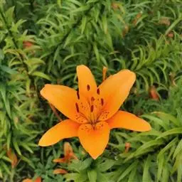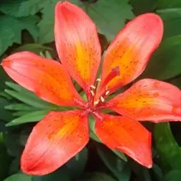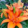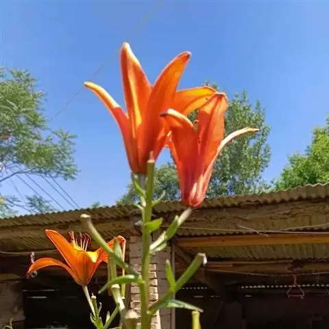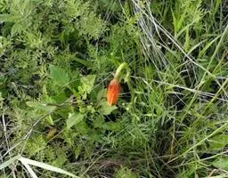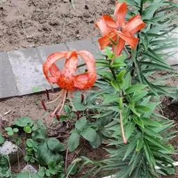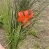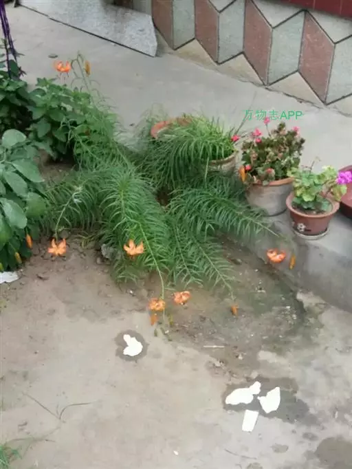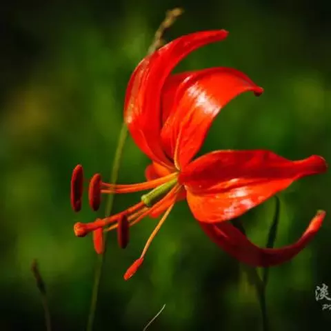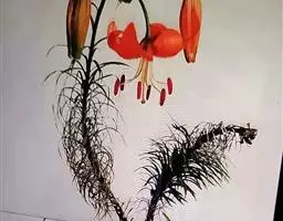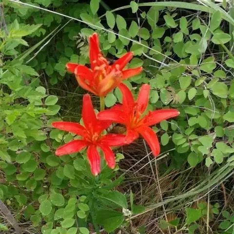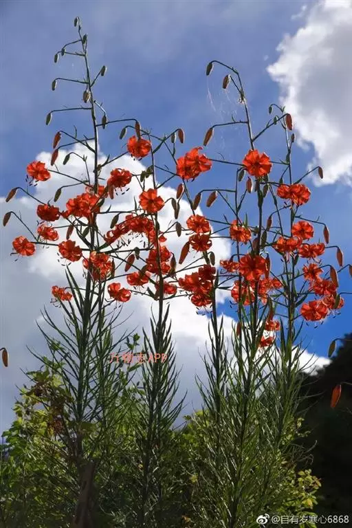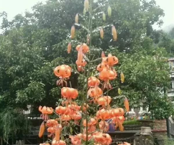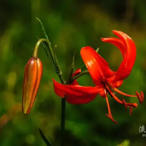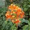 川百合(学名:Lilium davidii Duchartre):鳞茎为扁球形,白色。茎干绿色,上半部有小突起及稀疏的绵毛。叶片散生,为线状披针形, 边缘反卷并有明显的小乳头状突起,中脉明显,往往在上面凹陷,在背面凸出,叶腋有白色绵毛。花下垂,桔红色,花被上有密集的褐色斑点,花被极度反卷,背部疏生白绵毛。花期在7月份,果期在9月份。