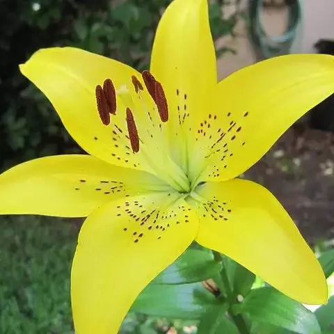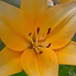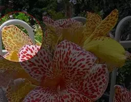 花单生或2-8朵排成总状花序;苞片叶状,长4-7.5厘米,宽3-7毫米;花梗长4-8厘米;花下垂,橙黄色,向基部约2/3有紫黑色斑点外外轮花被片长5-6厘米,宽1.2-1.4厘米;内轮花被片比外轮花被片稍宽,蜜腺两边有乳头状突起,在其外面的两边有少数流苏状的乳突、花丝长4-5.5厘米,无毛,花药长1.4-1.6厘米,花粉深桔红色;子房圆柱形,长1-1.2厘米,宽2-3毫米;花柱长为子房的2倍以上,柱头膨大,3浅裂。