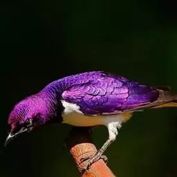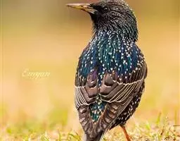紫翅椋鸟为中国西北地区常见的候鸟。它的主要特点是头、喉及前颈部呈辉亮的铜绿色;背、肩、腰及尾上复羽为紫铜色,而且淡黄白色羽端,略似白斑;腹部为沾绿色的铜黑色,翅黑褐色,缀以褐色宽边。夏羽和冬羽稍有变化。野外观察,通体黑色,闪有紫铜色和暗绿色的金属光泽。