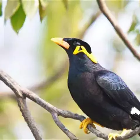 金冠树八哥为椋鸟科树八哥属的鸟类。体长约23厘米,闪辉黑色。特征为具翼斑及颏黄色,脸颊裸露皮肤粉黄色。…