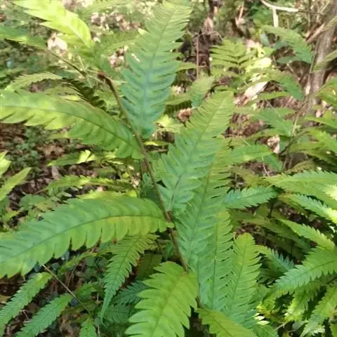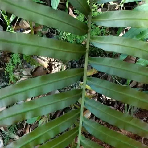 苏铁蕨(学名:Brainea insignis (Hook.) J. Sm)是乌毛蕨科,苏铁蕨属土生,大型草本植物。植株高可达1.5米。主轴木质,坚实,鳞片线形,先端钻状渐尖,边缘略具缘毛,红棕色或褐棕色,膜质。叶簇生于主轴的顶部,叶柄棕禾秆色,坚硬,叶片椭圆披针形,一回羽状;羽片对生或互生,线状披针形至狭披针形,能育叶与不育叶同形,叶脉两面均明显,叶革质,叶轴棕禾秆色,孢子囊群沿主脉两侧的小脉着生,最终满布于能育羽片的下面。