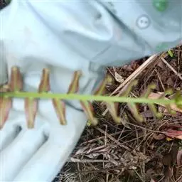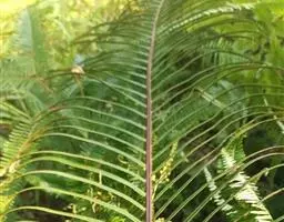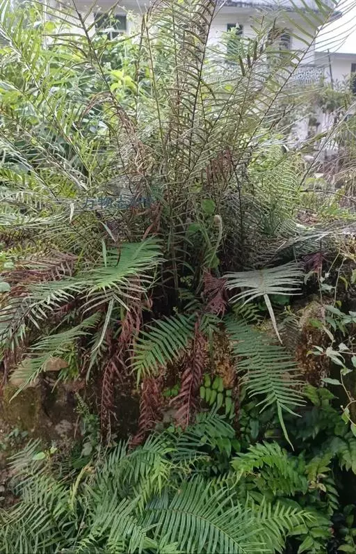 苏铁蕨 土生,大型草本。 植株高达1.5米。主轴直立或斜上,粗约10-15厘米,单一或有时分叉,黑褐色,木质,坚实,顶部与叶柄基部均密被鳞片;鳞片线形,长达3厘米,先端钻状渐尖,边缘略具缘毛,红棕色或褐棕色,有光泽,膜质。