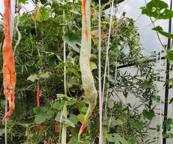 蛇瓜自瓜柄开始有数条绿色线纹,瓜体有的垂直,有的弓身,有的弯曲,有的卷尾,酷似—条条长蛇在棚架下展姿。在嫩瓜期,瓜体表面有白绿色相间的条纹似白花蛇,老熟后的瓜体表面又呈现红绿色相间的条纹似红花蛇,体态各异,栩栩如生,稀奇而美观。