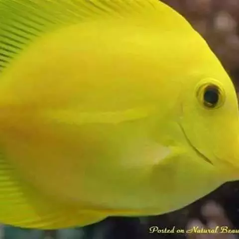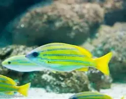 幼鱼身上有二条黑色条纹纵贯。一条位于身体正侧方,由头至尾柄末端,一条位于背部。身体下半部由嘴开始至尾鳍呈明黄色。成年以后的雌鱼依然大体保持着这种体色,雄鱼明黄色的位置则变成了棕黑色或黑色,体侧有一条发出金属光芒的浅蓝色条纹从腮盖后缘到尾柄末端。