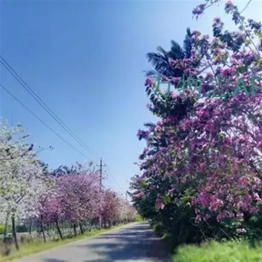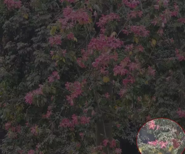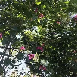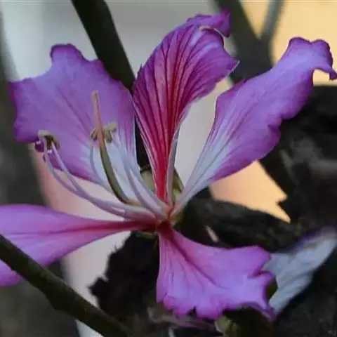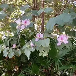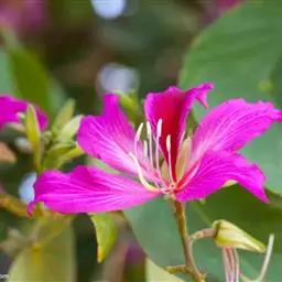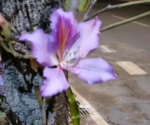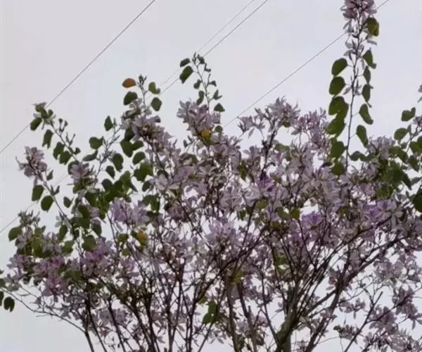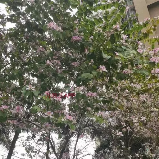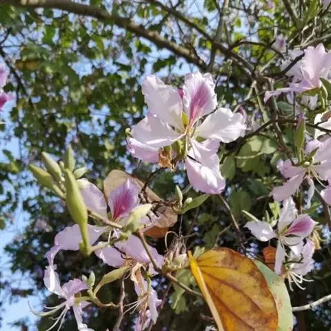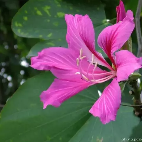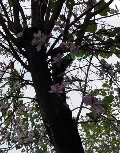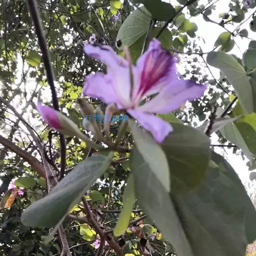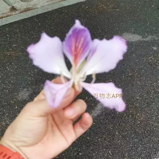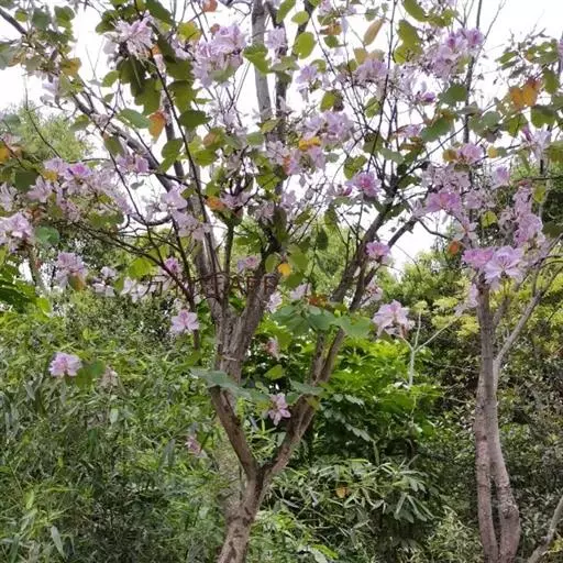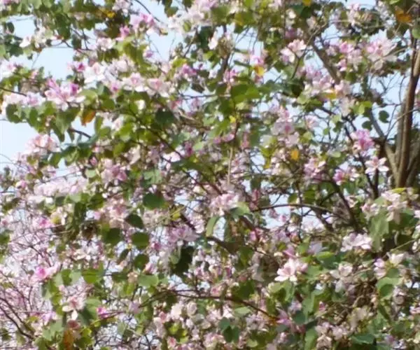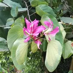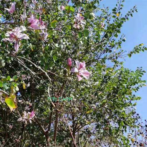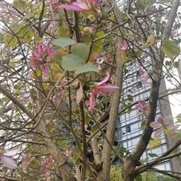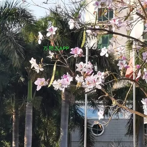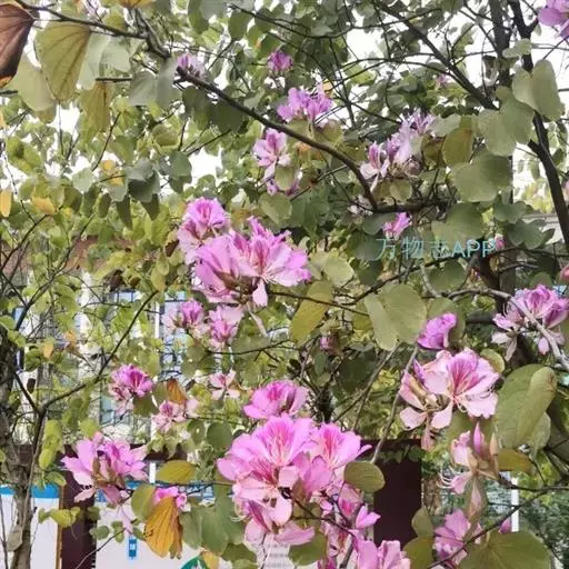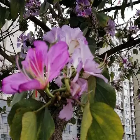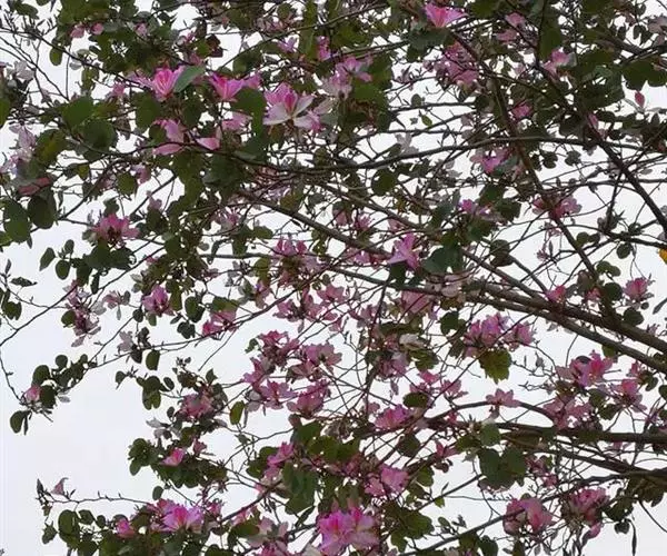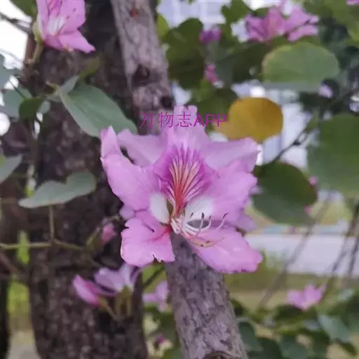 洋紫荆(学名:Bauhinia variegata L.):落叶乔木;树皮暗褐色,近光滑;幼嫩部分常被灰色短柔毛;枝广展,硬而稍呈之字曲折,无毛。叶近革质,广卵形至近圆形,宽度常超过于长度,先端2裂达叶长的1/3,裂片阔,钝头或圆,两面无毛或下面略被灰色短柔毛。总状花序侧生或顶生,极短缩,多少呈伞房花序式,少花,被灰色短柔毛;花大,近无梗;花蕾纺锤形;萼佛焰苞状,被短柔毛;花瓣倒卵形或倒披针形,长4-5厘米,具瓣柄,紫红色或淡红色,杂以黄绿色及暗紫色的斑纹。荚果带状,扁平;种子10-15颗,近圆形,扁平,直径约1厘米。花期全年,3月最盛。