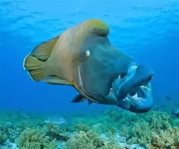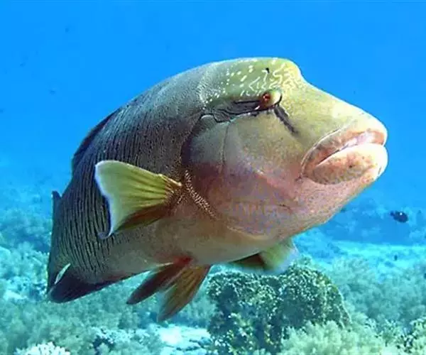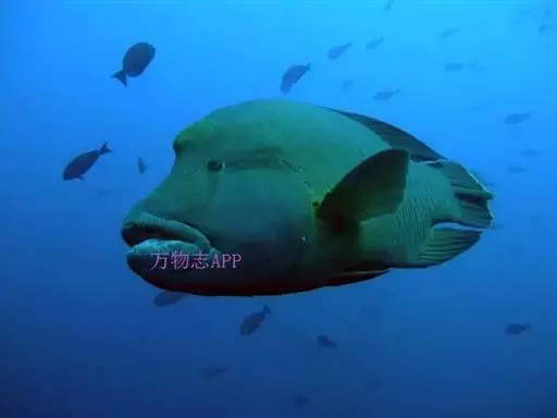 波纹唇鱼(学名:Cheilinus undulatus):体延长而呈长卵圆形;头部轮廓自背部至眼平直,然后凸出;成鱼前额突出口端位,中大;上下颌各具锥形齿一列,前端各有一对大犬齿;前鳃盖骨边缘具锯齿,左右鳃膜愈合,不与峡部相逢体被大形圆鳞。成鱼背鳍与臀鳍后部延长,达尾鳍基部;尾鳍圆形;老成鱼腹鳍可达肛门之后。幼鱼体浅绿色,每一鳞片具黑纹;眼后具2条黑纹。成鱼体绿色,体侧每一鳞片具黄绿色及灰绿色横线;头具橙色与绿色的网状细线;奇鳍密部细斜线;尾鳍后缘黄色。主要栖息于很陡的礁岩斜坡,海流道斜坡和泻湖的礁岩上,深度从2-60米左右。通常单独出现,偶尔会成对出现。是隆头鱼科中的大型种,个性温和,容易与人亲近。肉食性,以鱼类及底栖性动物为主要食物。波纹唇鱼是一种热带地区近海海域生存的著名巨型鱼类。分布于大洋洲、太平洋西部热带海域、大堡礁、印度洋西北部及红海。其体型巨大味道鲜美,被作为名贵食用鱼,在海洋馆或大型展示鱼缸中亦可作为观赏鱼。