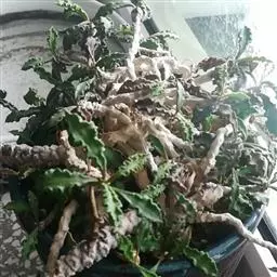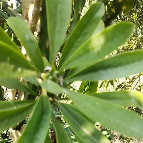 半常绿灌木或小乔木,高达5米;小枝红色,具乳汁。叶薄纸质,宽椭圆形至近圆形,先端钝尖,基部宽圆形;红色至紫红色。圆锥花序顶生,花小,黄白色。