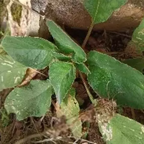 多年生草本。根状茎长2-7厘米,直径5-13毫米。叶丛生,具长柄;叶片椭圆形或卵状椭圆形,长6-12厘米,宽3-8厘米,顶端钝或圆形,基部浅心形,偏斜或楔形,边缘具小锯齿或全缘,上面密被短柔毛,下面密被褐色绵毛,侧脉每边6-8条,不明显成网状;叶柄长2-8厘米,密被褐色绵毛。