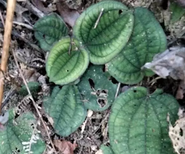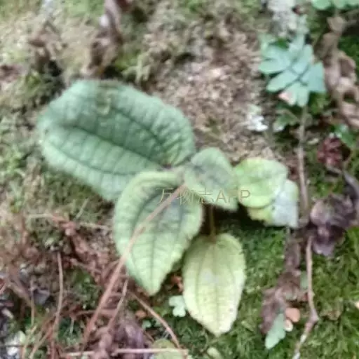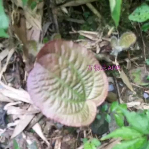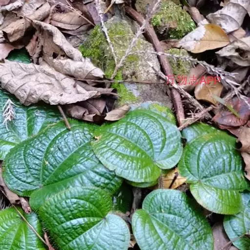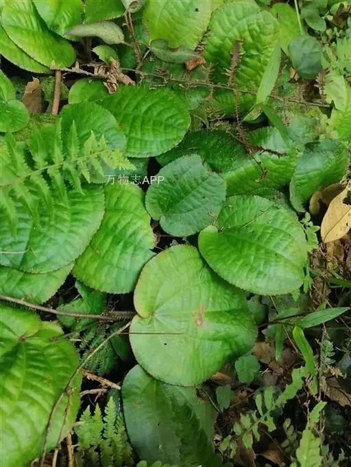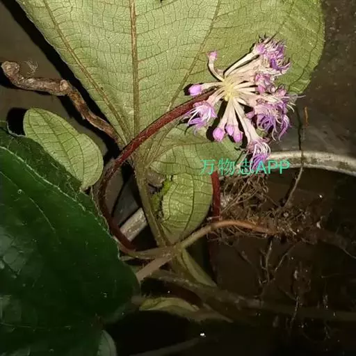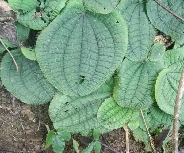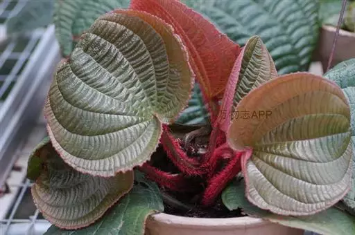 草本,茎极短,被红色粗硬毛,具粗短的根状茎,长约6厘米,略木质化。叶基生,叶片膜质,心形,顶端近圆形,基部心形,长宽20-30厘米或更大,边缘具不整齐的啮蚀状细齿,具缘毛,基出脉9,叶面无毛,基出脉平整,侧脉及细脉微隆起,背面密被糠秕,脉均隆起,明显,被红色长柔毛及微柔毛;叶柄圆柱形,肉质,长10-17厘米或更长,被红色粗硬毛,具槽。