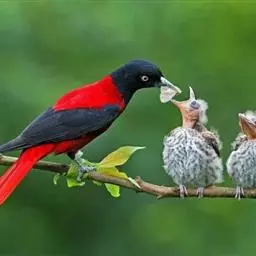 朱鹂:中等鸟类,体长23-28厘米。雄鸟绛紫红色,头、上胸及翼黑色。雌鸟上背及背部深灰色,…