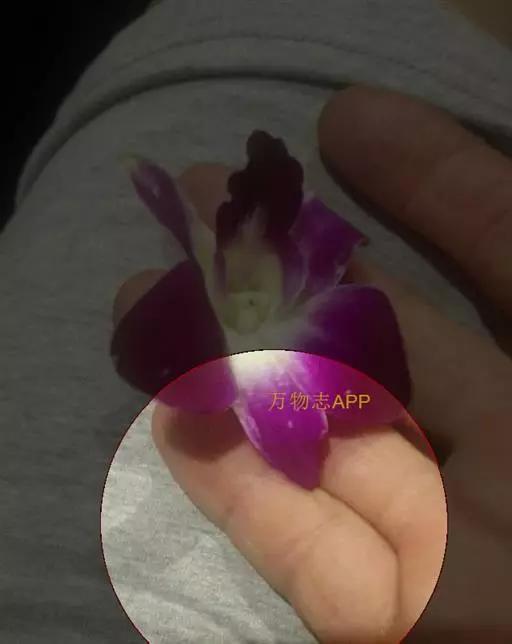 总状花序从具叶或落了叶的老茎中部以上部分发出,长2~4厘米,具1~4朵花;花序柄长5~15毫米,基部被数枚筒状鞘;花苞片膜质,卵状披针形,长6~13毫米,先端渐尖;花梗和子房淡紫色,长3~6毫米;花大,白色带淡紫色先端,有时全体淡紫红色或除唇盘上具1个紫红色斑块外,其余均为白色;中萼片长圆形,长2.5~3.5厘米,宽1~1.4厘米,先端钝,具5条脉;侧萼片相似于中萼片,先端锐尖,基部歪斜,具5条脉;萼囊圆锥形,长6毫米;花瓣多少斜宽卵形,长2.5~3.5厘米,宽1.8~2.5厘米,先端钝,基部具短爪,全缘,具3条主脉和许多支脉;唇瓣宽卵形,长2.5~3.5厘米,宽2.2~3.2厘米,先端钝,基部两侧具紫红色条纹并且收狭为短爪,中部以下两侧围抱蕊柱,边缘具短的睫毛,两面密布短绒毛,唇盘中央具1个紫红色大斑块;蕊柱绿色,长5毫米,基部稍扩大,具绿色的蕊柱足;药帽紫红色,圆锥形,密布细乳突,前端边缘具不整齐的尖齿。花期4~5月。