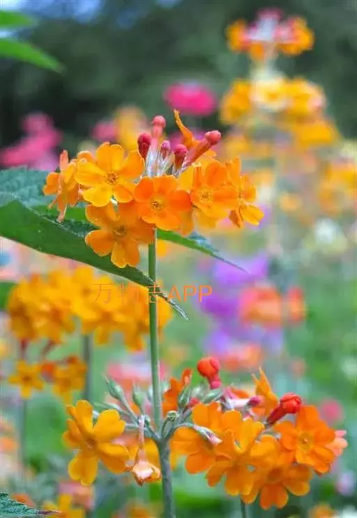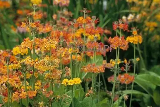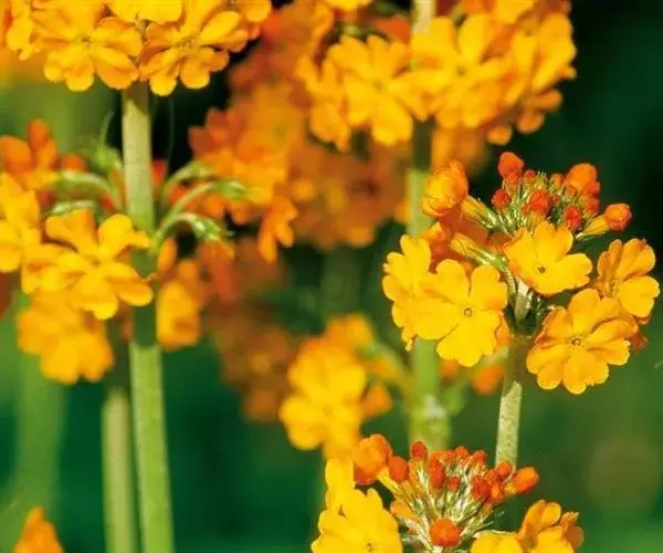 花葶粗壮,高20-70厘米,节上和顶端被乳黄色粉,具伞形花序5-7轮,每轮具(4)8-16花;苞片线形,通常稍长于花梗;花梗长1.3-2.5厘米 ,微被粉;花萼钟状,长5-9.5毫米,分裂达中部或略过之,裂片披针形,先端渐尖成钻状,外面微被粉,内面密被乳黄色粉;花未开放时呈深橙红色,开后为深橙黄色,冠檐直径达2厘米,裂片长圆伏倒卵形,先端微凹,长花柱花:冠筒长10-12毫米,雄蕊着生处距冠筒基部约5毫米,花柱长约8.5毫米;短花柱花:花冠筒长14-15毫米,雄蕊距冠筒基部约10毫米着生,花柱长约5毫米。蒴果近球形,约与花萼等长。花期6-7月。