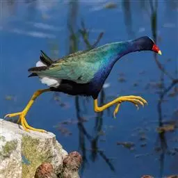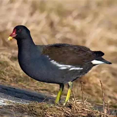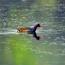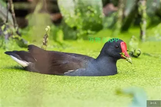 红冠水鸡,拉丁名:Gallinula chloropus,中文名:黑水鸡,又名红冠水鸡、红骨顶、红鸟、江鸡;英文名:Common Moorhen,属鹤形目秧鸡科水鸡属,是中型涉禽。全体大致黑色。嘴红色,嘴尖端黄色,脚绿色。遍及全世界,在北纬32度以南越冬。多见于湖泊、池塘及运河,不善飞,起飞前先在水上助跑很长一段距离。黑水鸡已被列入国家三有保护鸟类。黑水鸡雏鸟黑色,幼鸟和亚成鸟转为灰白色,至成鸟又转为黑色。