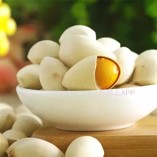 椭圆形移动图册,长1.5~2.5cm,宽1~2cm,厚约1cm。表面黄白色或淡黄棕色,平滑坚硬,一端稍尖,另端钝,边缘有2~3条棱线,中种皮(壳)质硬。内种皮膜质。一端淡棕色,另端金黄色。种仁粉性,中间具小芯。味甘、微苦。