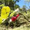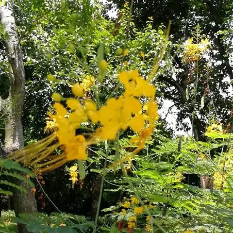 圆锥花序顶生或腋生,长约与叶相等;苞片大,披针形,早落;花梗长15毫米,被细柔毛;花托浅钟形;萼片5,稍不等,下面一片比其他的大,呈兜状;花瓣黄色,阔倒卵形,长约9毫米,最上面一片基部带粉红色,具柄;雄蕊稍伸出,花丝下部密被柔毛;子房被灰色绒毛,具柄,花柱细长,被毛,柱头截平。荚果木质,稍压扁,近长圆形至长圆状倒卵形,长约7厘米,宽3.5-4厘米,基部稍狭,先端斜向截平,上角有外弯或上翘的硬喙,不开裂,红棕色,有光泽;种子3-4颗,长圆形,稍扁,浅褐色。花期5-10月;果期7月至翌年3月。