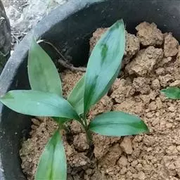 准备好兰盆及植料后,将兰株倒拿(根在上,叶在下)放于水龙头下以慢水冲洗,但水压切忌过强,以免伤兰根及叶子。用拇指和食指抓住兰头,小指抵住盆缘,用竹筷将根固定,当放入盆内时,尽量不要让根接触到盆壁。将豆粒大的混合石砾倒入盆底至三分之一处。然后倒入中粒植料至五分之四处,填实和尽量不要留下空间。将竹筷拔出,并摇实盆中植料。填实植料后,再用大粒植料埴入至距盆缘1.5厘米处。最后再倒入豆粒大植料,以将假鳞茎全部埋入土中为度,然后充分摇实。用压土工具轻压植料,并将表面弄平。种植完毕后,植料在盆中以中央稍高为好。
