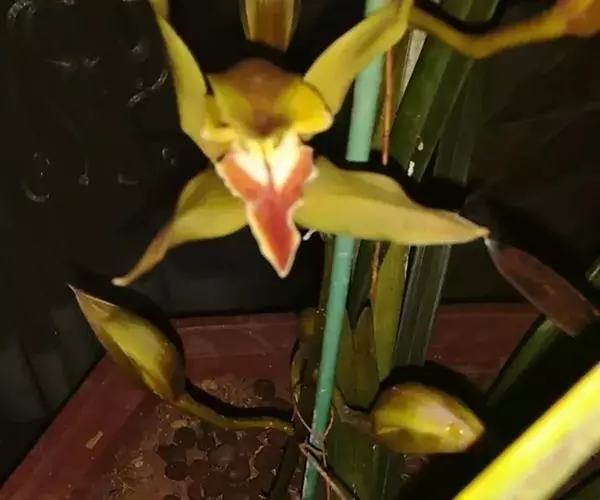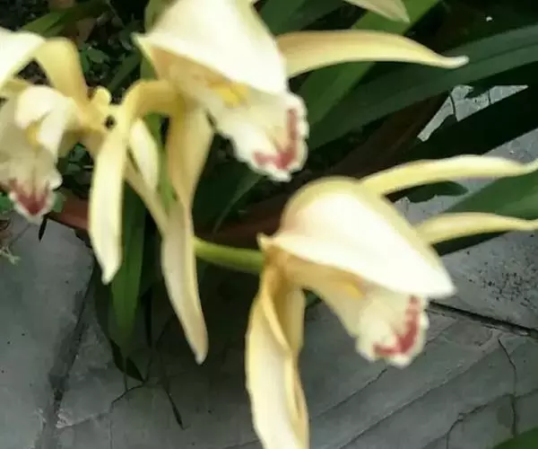 花葶从假鳞茎基部穿鞘而出,近直立、平展或外弯,长60-80厘米;总状花序具10-20朵或更多的花;花苞片卵状三角形,长约3毫米;花梗和子房长3-4厘米;花直径7-9厘米,无香气;萼片和花瓣苹果绿色或黄绿色,有红褐色纵脉,唇瓣淡黄色,中裂片上有深红色的锚形斑(或V形斑及1条中线);萼片狭倒卵状长圆形,长4-5厘米,宽1.4-1.6厘米。