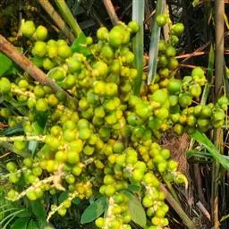 三药槟榔是一种热带或南亚热带繁茂生长的绿阴树种,茎干挺拔强健,枝叶常年青翠,形若翠竹,耐阴性强,挂果期长。既有南国热带风情的优美叶态,又有橙黄、赭红、累累果实的内在情调,是一种极为珍贵的观叶、观花、观果植物。